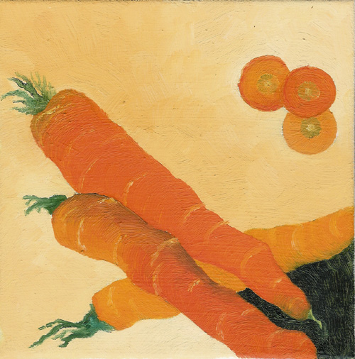 Früchtebild 44 - Karotten, scheibchenweise2005, Öl auf Leinwand, 20 x 20 cm